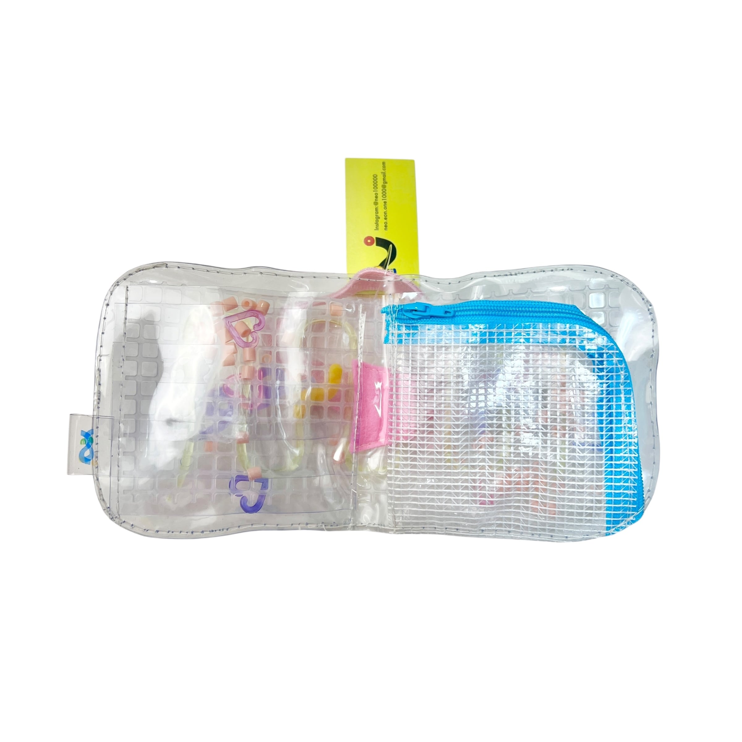 クリアの塩ビ素材の中に、オリジナルで制作されたうねうねパーツと、カラフルなおもちゃのパーツやビーズが入っていて、中でシャカシャカ動きます◎