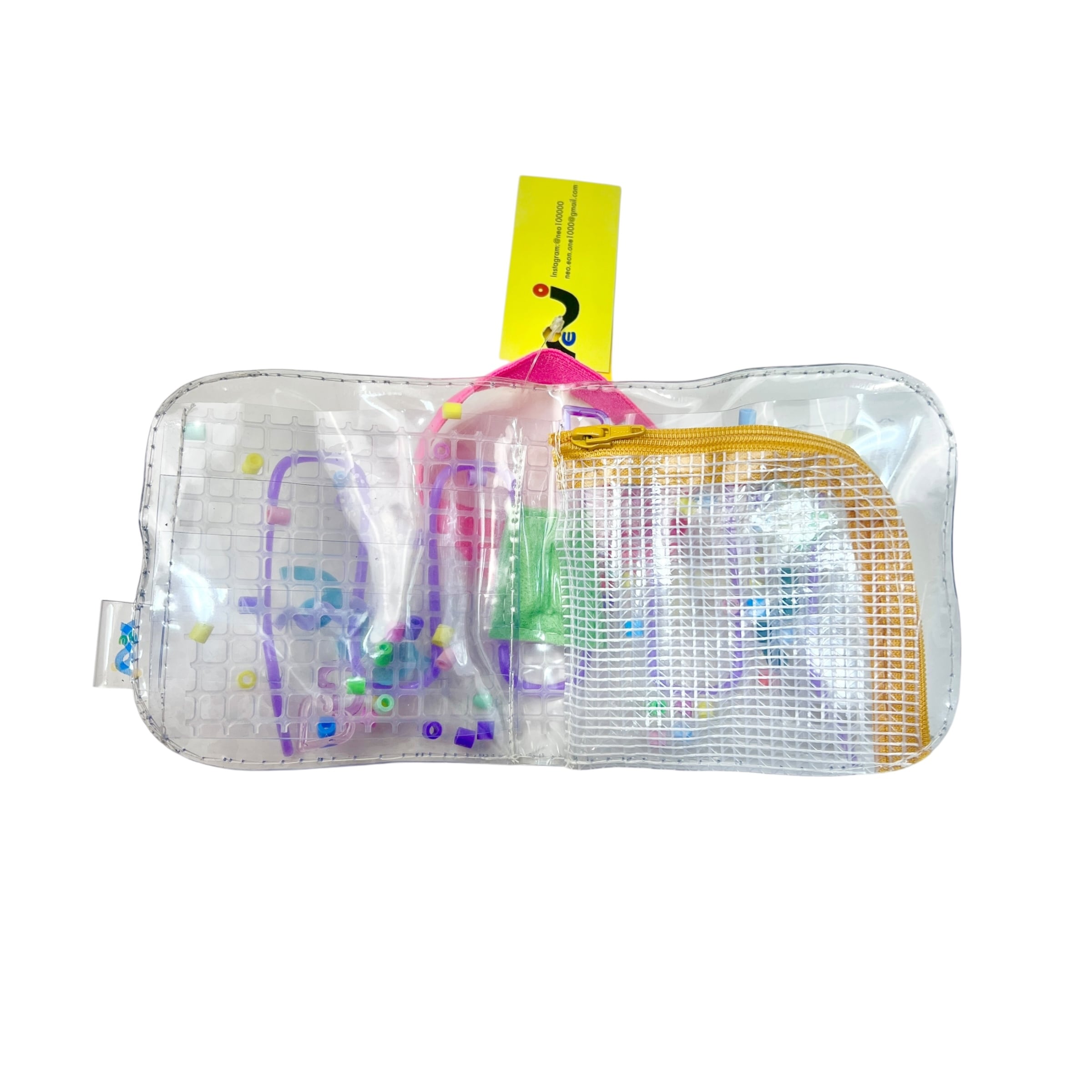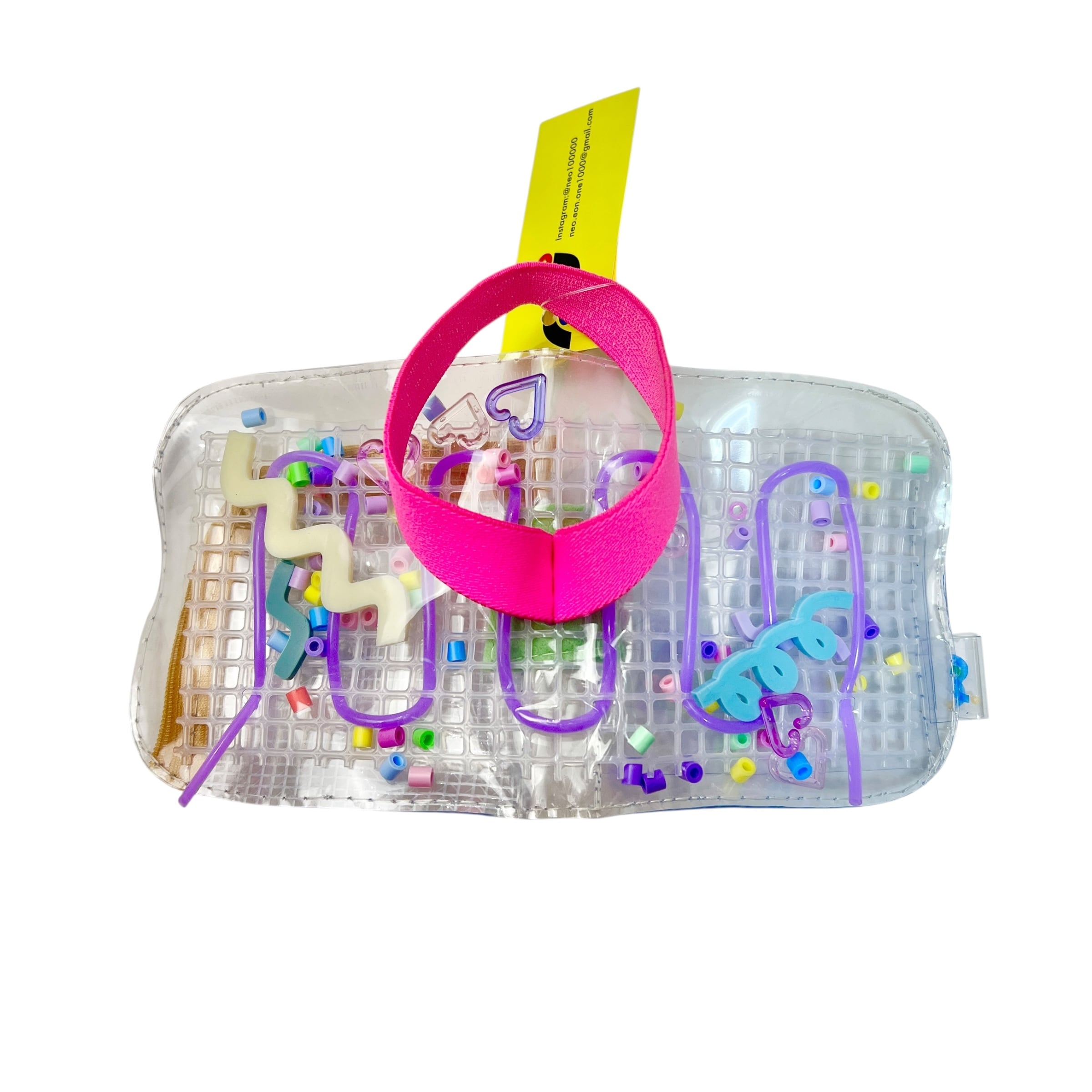 クリアの塩ビ素材の中に、オリジナルで制作されたうねうねパーツと、カラフルなおもちゃのパーツやビーズが入っていて、中でシャカシャカ動きます◎